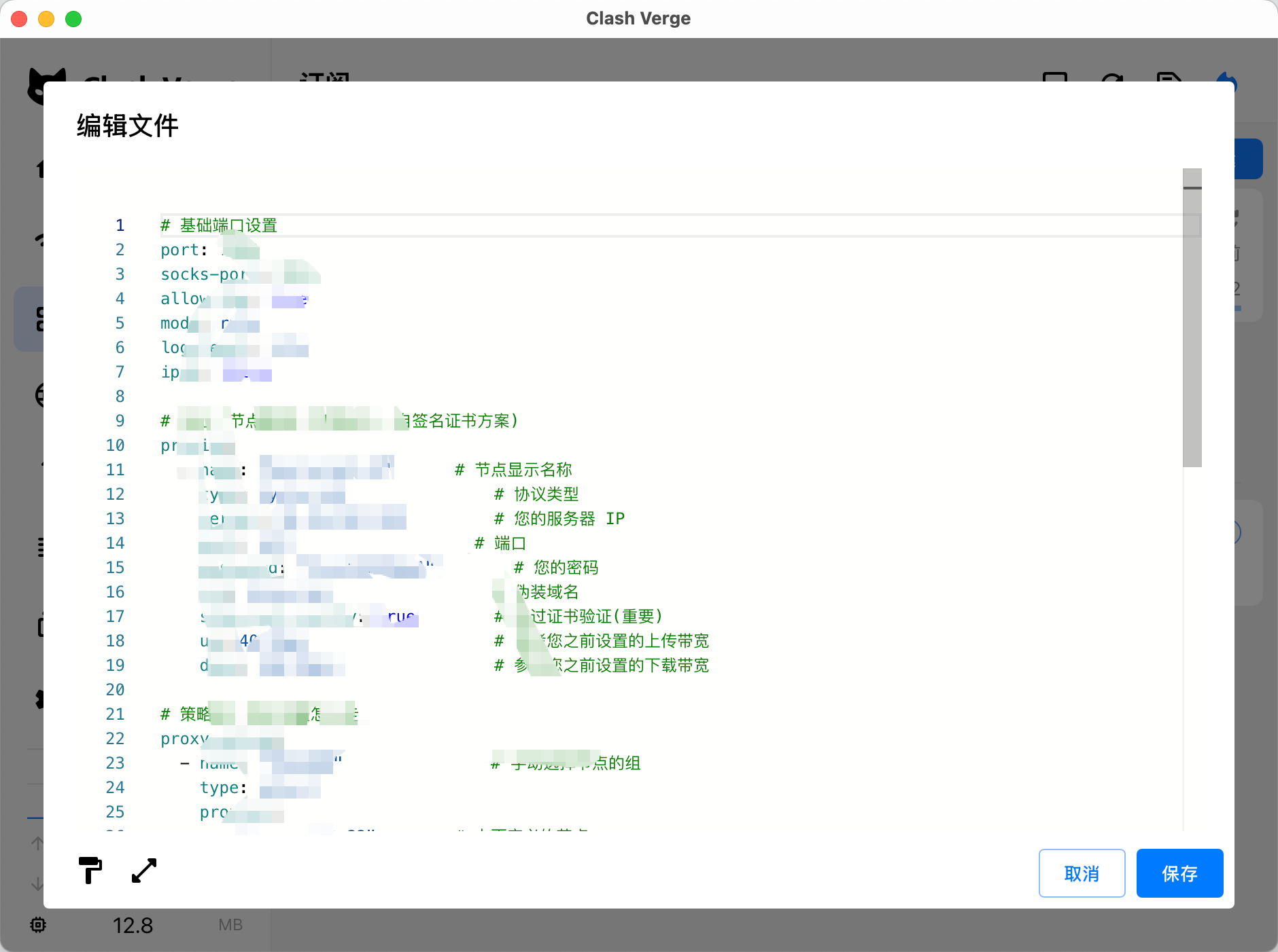 将配置文件中的内容全部删除,填入以下配置。根据自己的需要选择使用 CA 证书,还是使用自签证书,将对应的注释取消即可