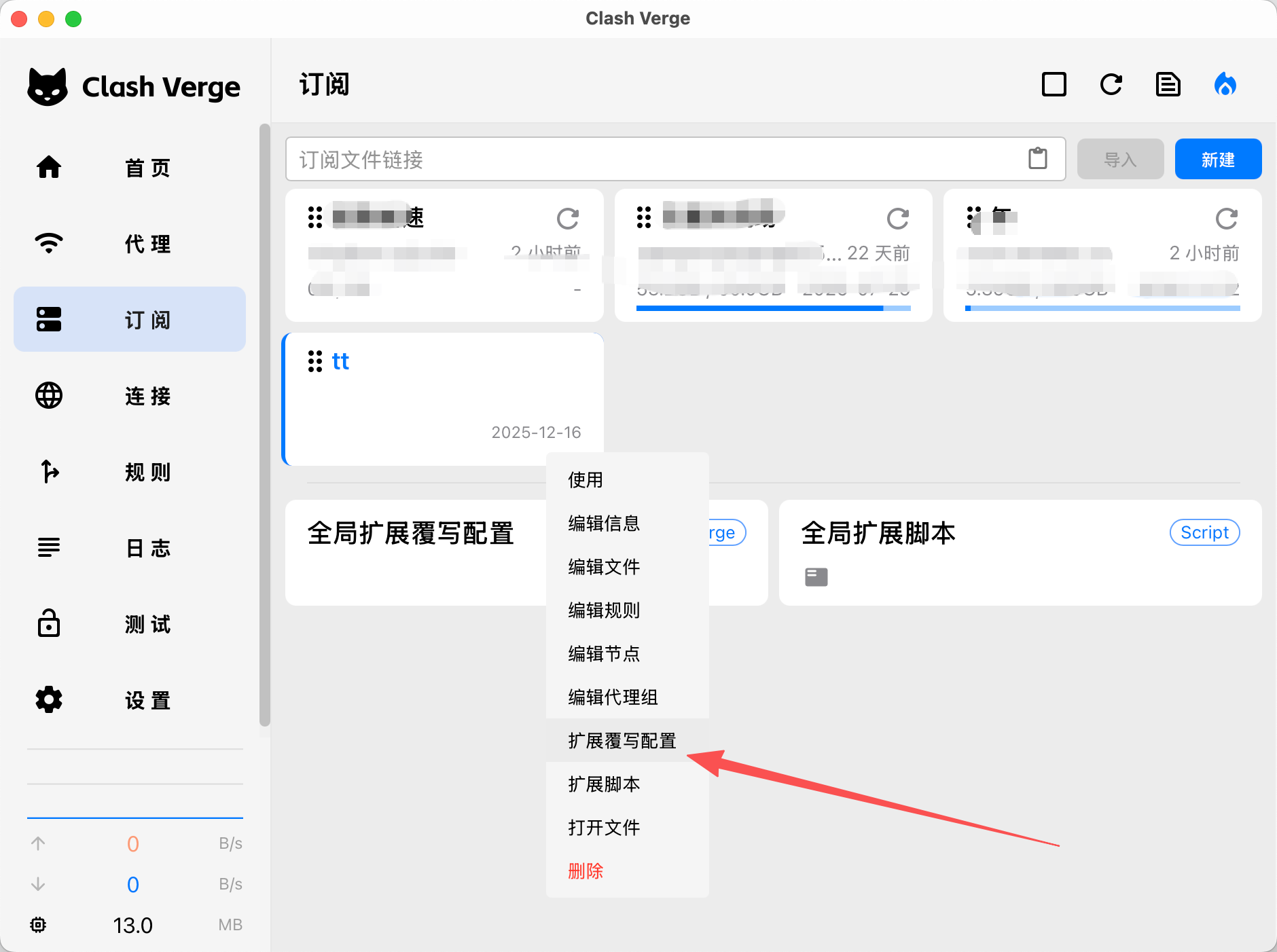 2.右键点击刚刚新建的订阅,进入 扩展覆写配置